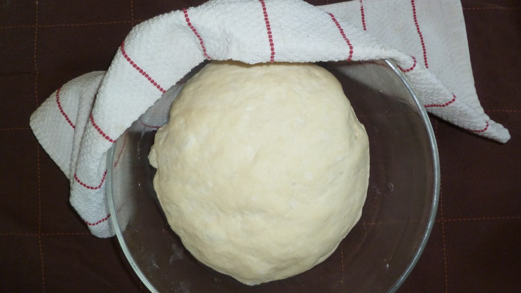 • Cover the dough and leave it at room temperature until it begins to rise. In appearance it will become puffier and some air bubbles will appear on the surface. A time estimate for this is about 45 minutes. But, as a knowledgeable breadmaker advised, “Watch the dough, not the clock.”