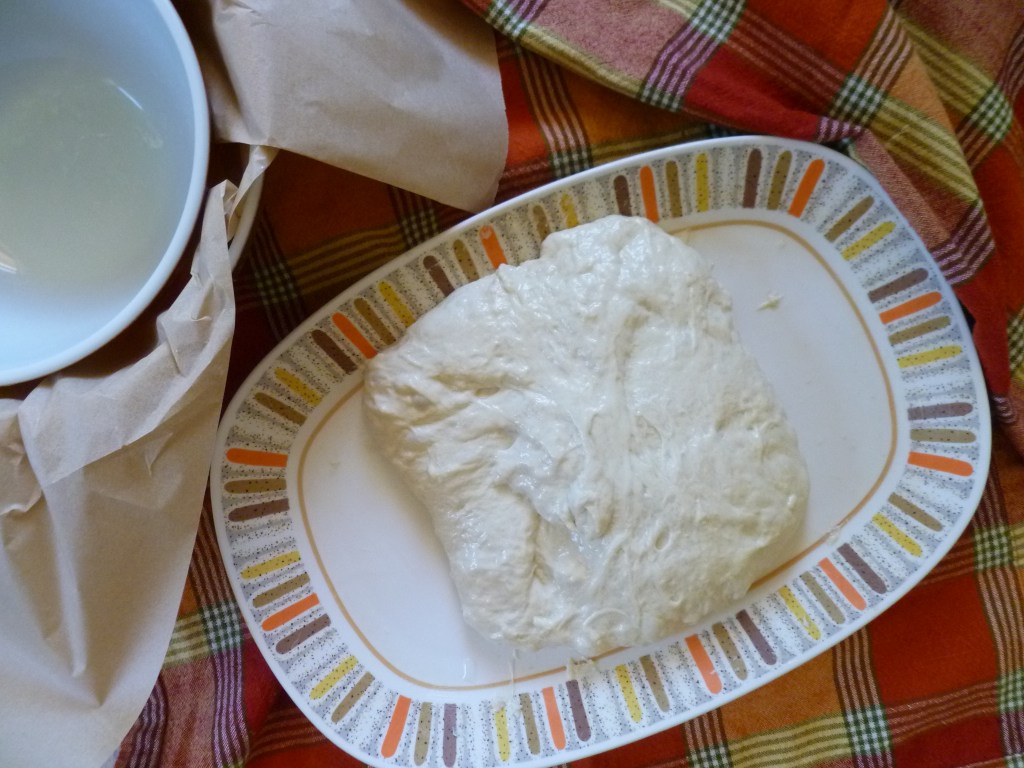 • Work the dough: (The dough is sticky. It will be easier to work it if you moisten your hands.) Imagine the round shape as having 4 sides. Pick up the top side and stretch it up and down toward the bottom side. Pick up the bottom side and stretch it up toward the top side. Pick up the right side, stretch it up and over to the left side. Pick up the left side and stretch it up and over to the right. Stretch all four sides of the dough in this way once more. The purpose of all this stretching is simply to make the dough smoother and more elastic. It is not an exact procedure.