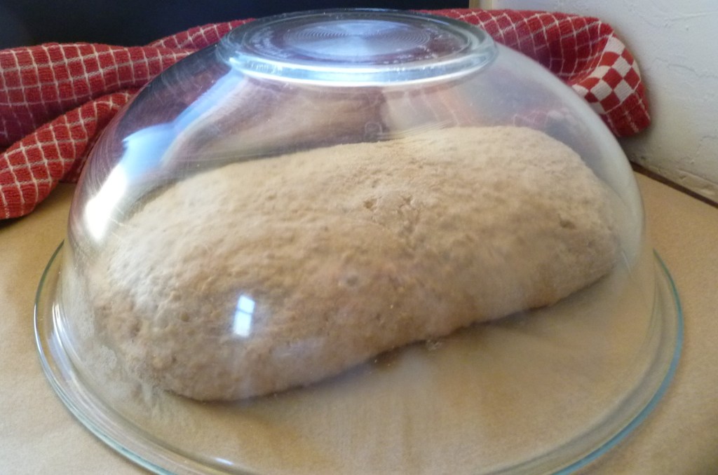 • Turn the dough out onto the floured pastry board and form it into a fat, oblong loaf. Place it on the parchment-lined baking sheet. Cover it. (A very large bowl or a cotton kitchen towel makes a good cover.) Let the dough rise until doubled in size. Again, 1 hour is an estimate.