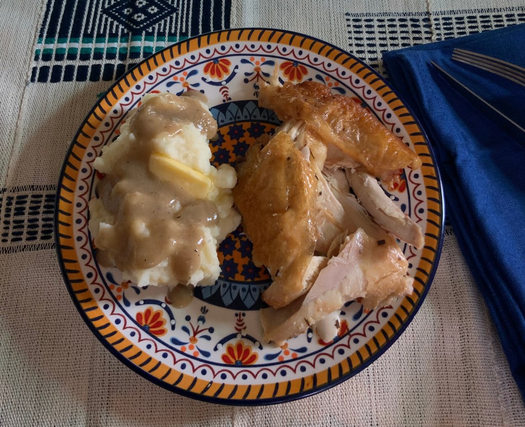 • a Rimmed Pan lined with aluminum foil to hold the chicken during the last half hour of roasting while making the gravy from the drippings in the roasting pan