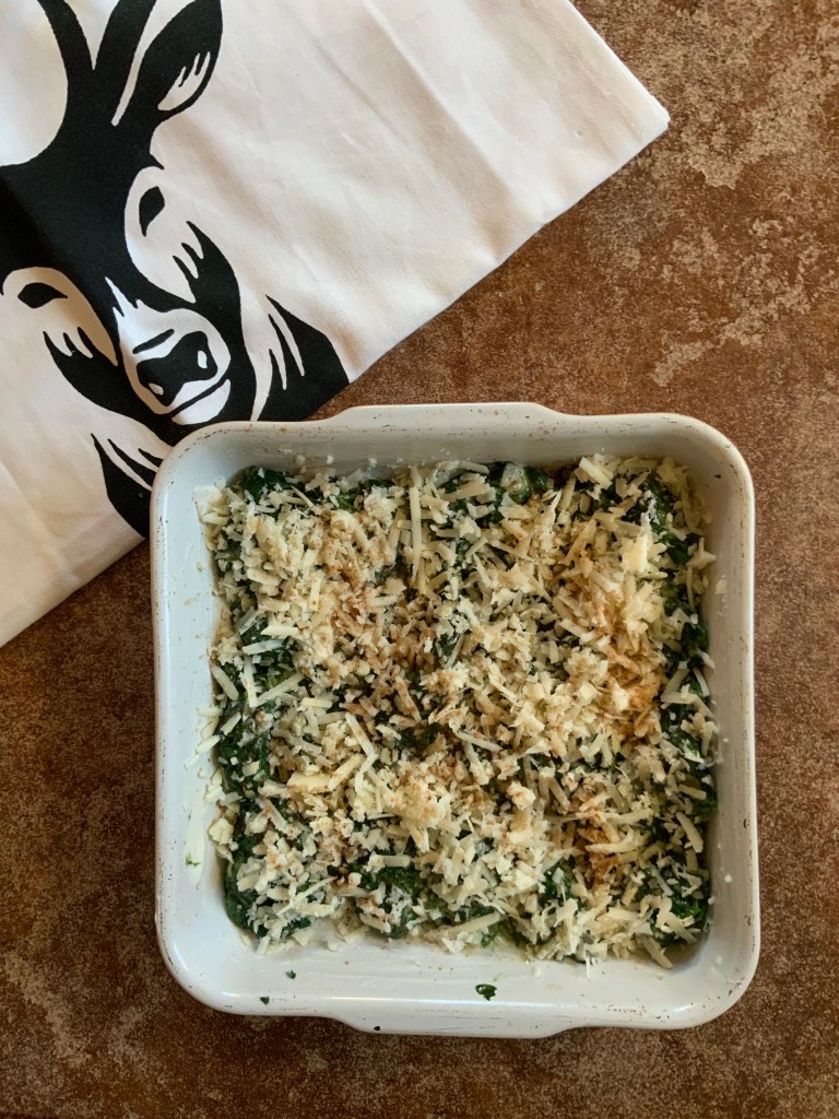 - Transfer the spinach to the baking dish. Sprinkle it with the cheese and a little nutmeg,