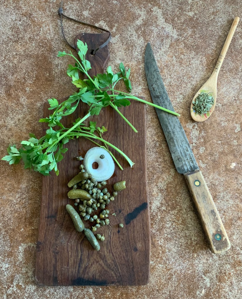 “Most of the cold sauces…are very highly flavored and seasoned. Acids such as vinegar and lemon juice, also herbs, capers and mustard are commonly used ingredients.” Louis Diat from French Cooking for Americans (1946).
