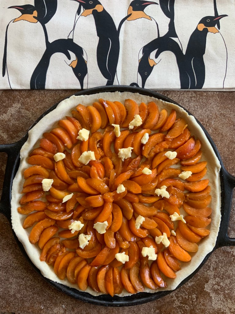 - Place the apricot slices on the pastry in concentric circles and dot them with the butter.
