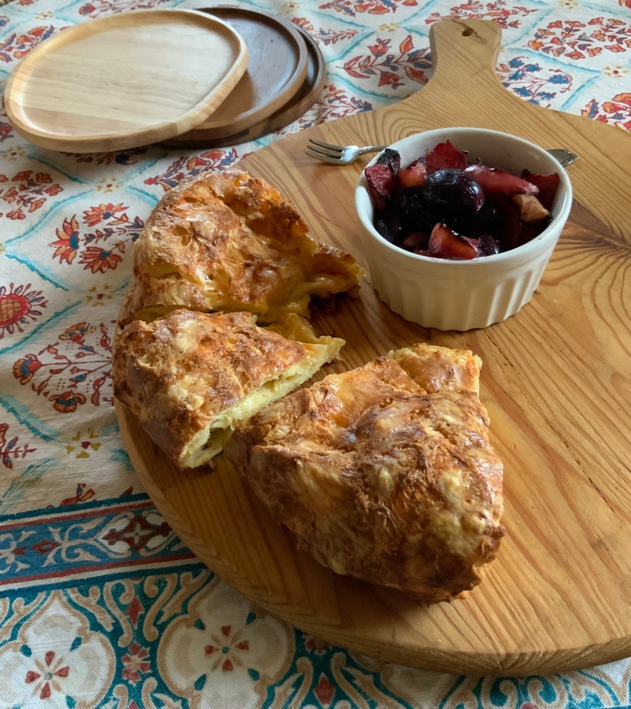 - Cut the gougère in slices for serving and arrange the slices in a circle on a plate or wooden board. If included, place the bowl of Roasted Black Grapes and Apple in the center.