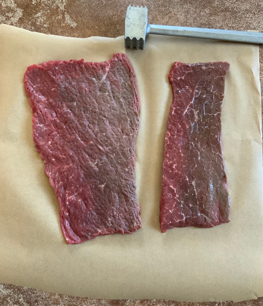 • 2 Bottom Round Steaks, each about 1/2-inch (a little more than 1 cm) thick before flattening, weighing about 1 pound (around 454 g) each. The steaks in the photos are about 9 inches long (aboaut 23 cm) , with a tapered width of 4 to 3 inches (around 7.5 to 10 cm).