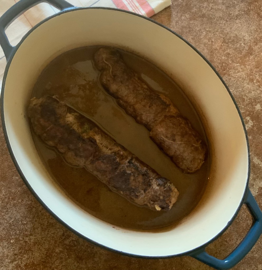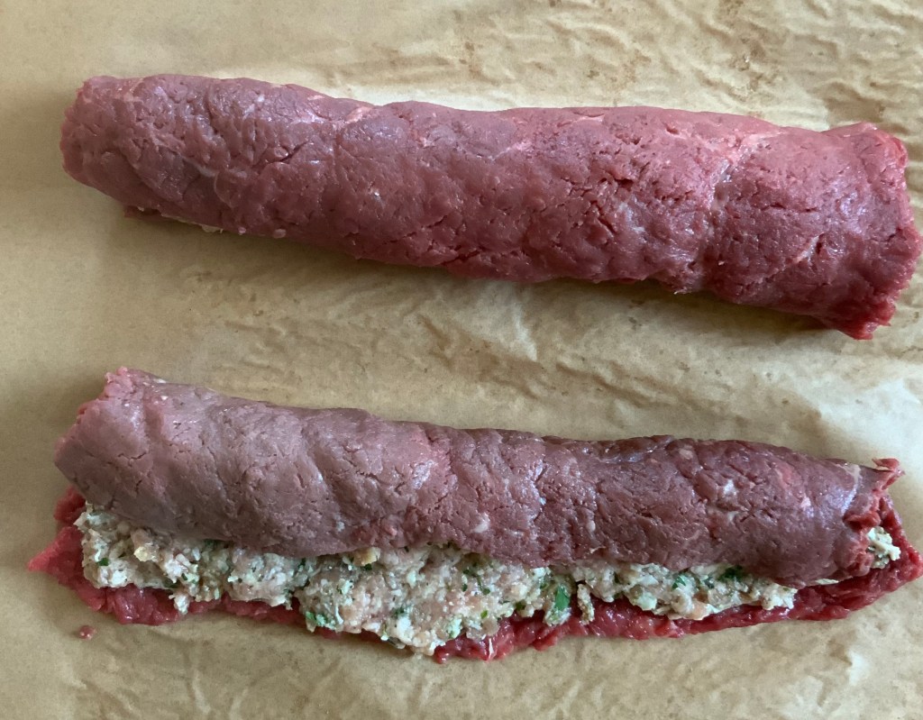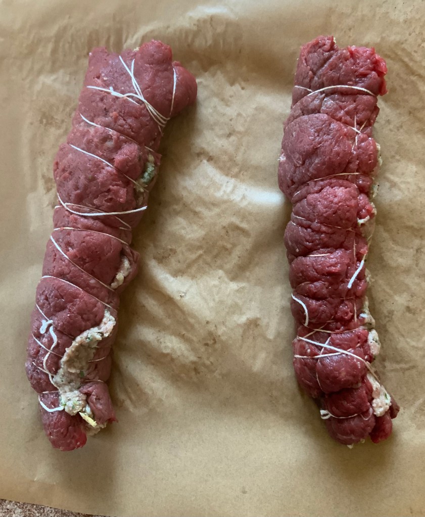 • Wrap kitchen twine tightly around each cylinder this way and that from end to end. There is no need to tie the twine. Flouring will adhere it to the steaks. A little stuffing may show around the edges and an insignificant amount will come out during braising. The braising liquid is sieved before making the sauce.