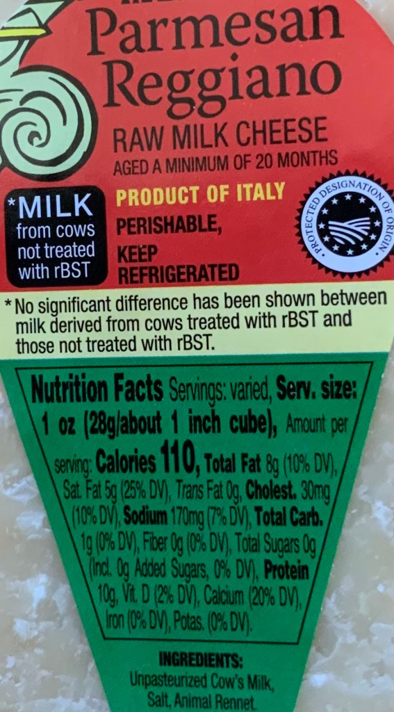 Parmigiano Reggiano PDO: This is the only type of Parmesan used in these recipes. It is Imported Italian Parmesan and bears the PDO certification that it is authentically made in a specific region by a traditional process with traditional ingredients of which there are three: Raw Milk, Animal Rennet and Salt. The cheese is always bought in block form.