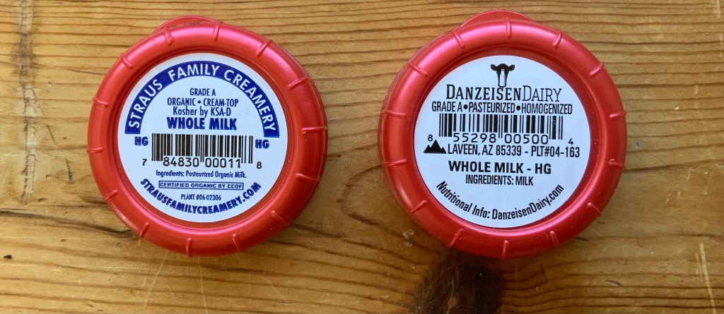 All recipes use milk that is minimally processed. This means that the raw milk is not separated into all its various component parts and put back together. Either only the cream is separated out from the milk or the cream and milk are not separated and the raw milk is pasteurized very briefly at a high temperature. The latter is “cream top milk”. The cream and milk separate after bottling, the cream forming a layer on the top which may be spooned out for a separate use or shaken back into the milk. The sources for both types of whole milk are local so that the time between bottling and arriving on the grocery shelf is shorter than is the case with standard brands. It is bottled in glass. These types of milk remain fresh considerably longer than the common store brands.