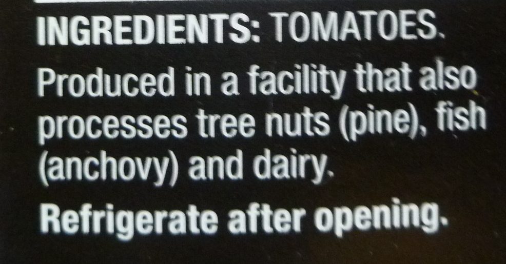 Preserved Tomatoes: thefoodlessprocessed uses imported Italian boxed tomatoes in recipes made with preserved tomatoes. The tomatoes contain one-ingredient: Tomatoes. The box size is 26.46 oz (about 750g or 3 cups).