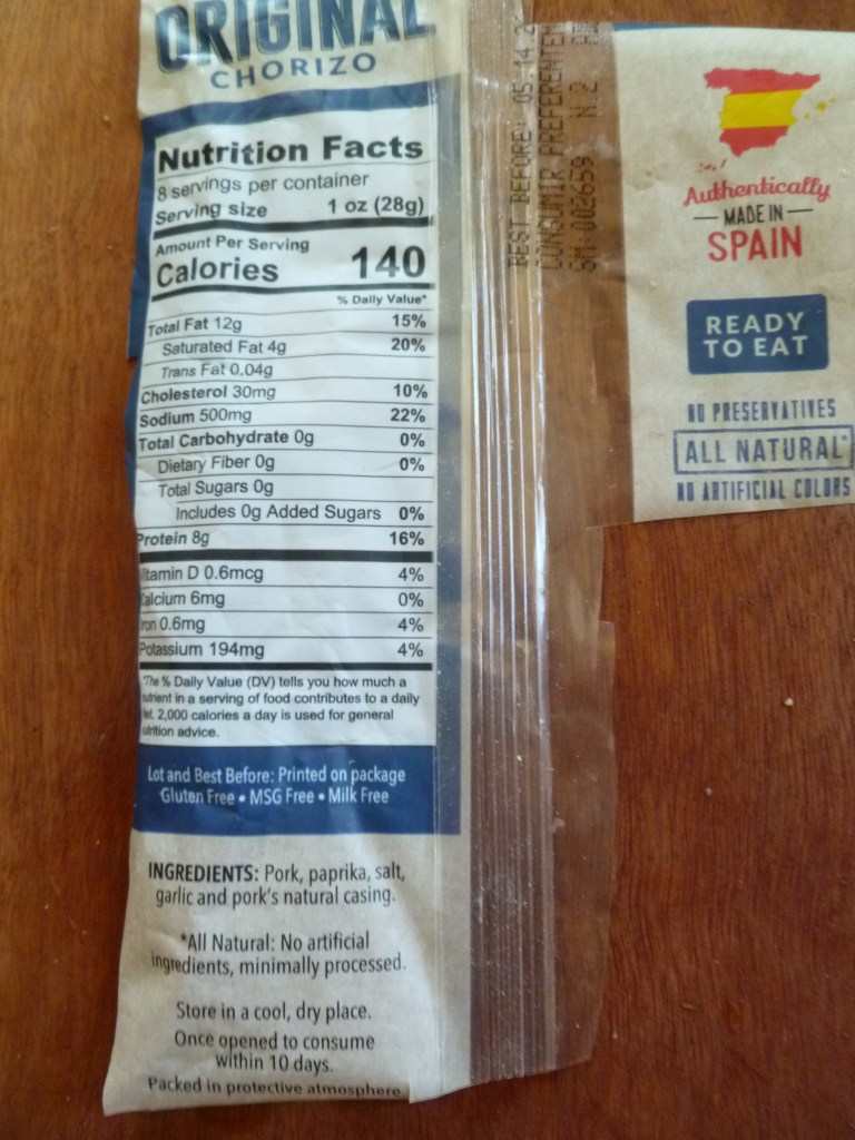 Imported Spanish Chorizo (mild or spicy) is a less processed option replacing Pepperoni. The ingredients are: Pork, Paprika, Garlic, Salt and Natural Pork Casing. The casing is paper-thin and peels away easily.