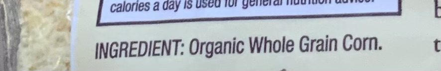 We use Organic Cornmeal: medium or coarse grind, whole grain and stone ground. It contains one ingredient: Organic Whole Grain Corn.