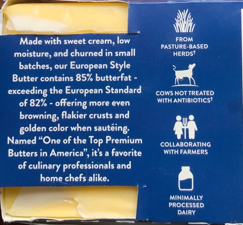 The European style butter we eat on our bread and cook with contains one ingredient: Certified Organic Pasteurized Cream.