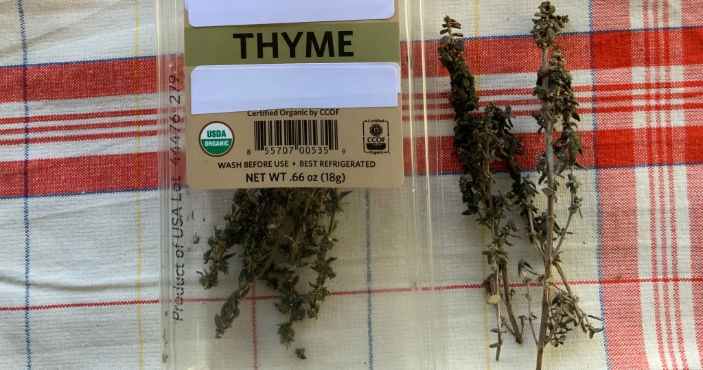 Fresh Thyme: A packet of fresh thyme may be frozen. Take out the number of branches you want and return the rest to the freezer. The frozen branches will be brittle and will separate without breaking. The leaves can be stripped off a branch easily. Organic Thyme is preferable since it is grown without the use of synthetic chemical pesticides.